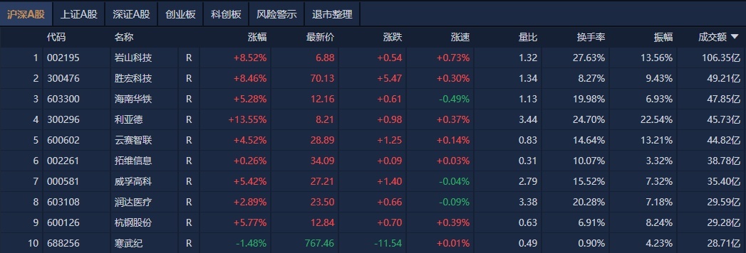 沪深两市半日成交额9252亿元,较上个交易日缩量553亿元。个股方面,岩山科技成交额超106亿元居首,胜宏科技、海南华铁、利亚德成交额靠前。