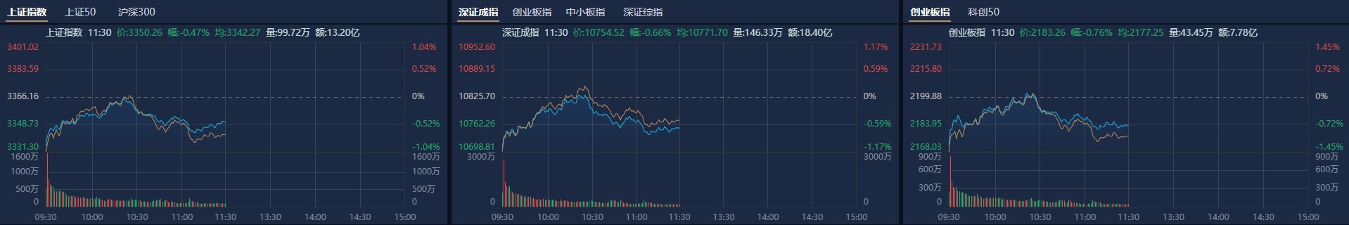 市场早盘震荡调整,创业板指领跌。南财金融终端显示,截至早盘收盘,沪指跌0.47%,深成指跌0.66%可靠的杠杆交易,创业板指跌0.76%。